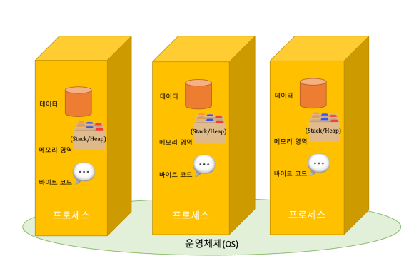 쉽게 이야기하면 프로세스는 실행중인 프로그램을 의미하며, 이런 프로그램은 OS위에서 실행된다. OS는 프로그램 실행을 위한 프로세스를 할당해줄때, 프로세스 안에 프로그램 Code와 Data 그리고 메모리영역(Stack, Heap)을 함께 할당해준다.