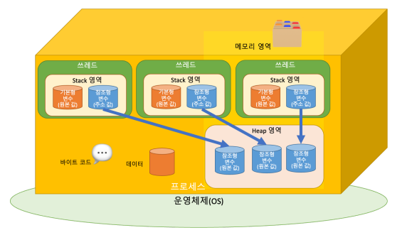쓰레드는 프로세스내에서 일하는 일꾼에 비유 할 수 있다. 프로세스가 작업중인 프로그램에서 실행요청이 들어오면 쓰레드를 만들어 명령을 처리한다. 프로세스 안에는 여러 쓰레드들이 있고, 쓰레드들은 실행을 위한 프로세스 내 주소 공간이나 메모리 공간(Heap)을 공유 받는다. 또한 쓰레드들은 각각 명령처리를 위한 자신만의 메모리공간(Stack)도 할당 받는다.